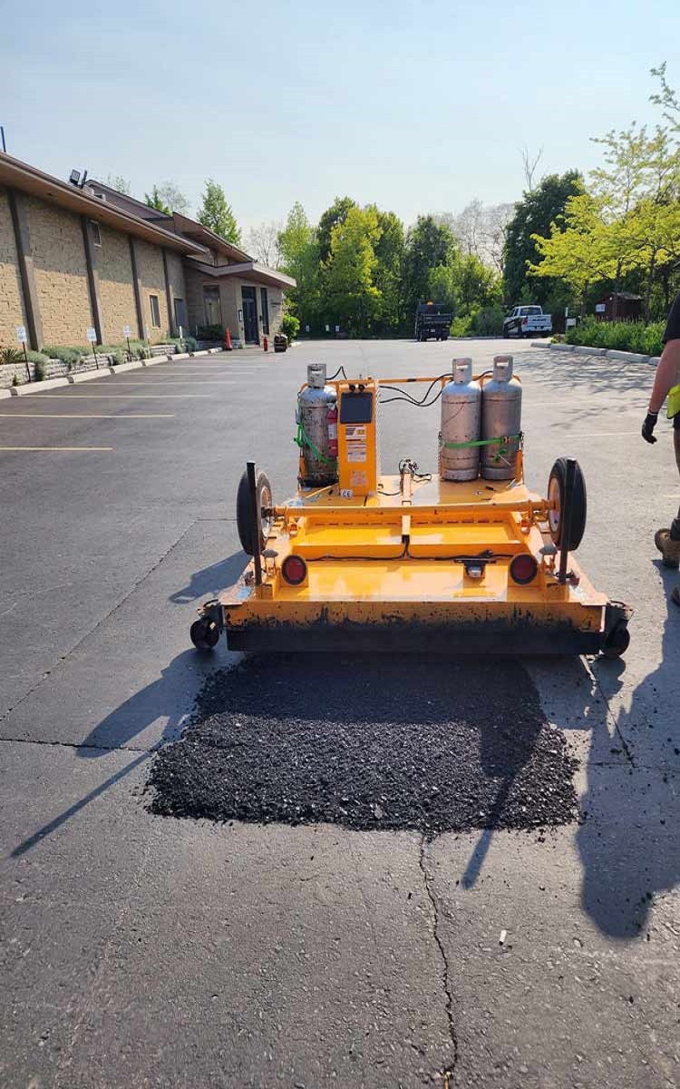 Potholes, cracks and other asphalt damage can be repaired with infrared patching. This creates a seamless integration of new asphalt with the existing pavement, preventing water from entering and freezing, and providing a high-quality, long-lasting repair!
